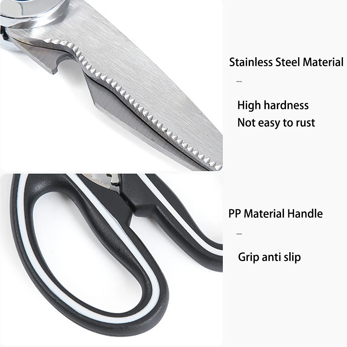Feature01: Stainless Steel Material,High hardness Not easy to rust;PP Material Handle,Grip anti slip;Multi functional scissors, suitable for scraping fish scales, cutting meat, opening nuts, and bottle openers;Toothed design suitable for planing fish scales, simple and easy to use;Concave design, suitable for cutting objects that are prone to slipping off;Clever design in the middle of the handle, sharp teeth for anti slip, and the ability to grip walnuts tightly with force;Reverse buckle design, can be used to open bottle caps;Humanized anti slip handle, large grip hole, frosted surface treatment, more comfortable grip and anti slip