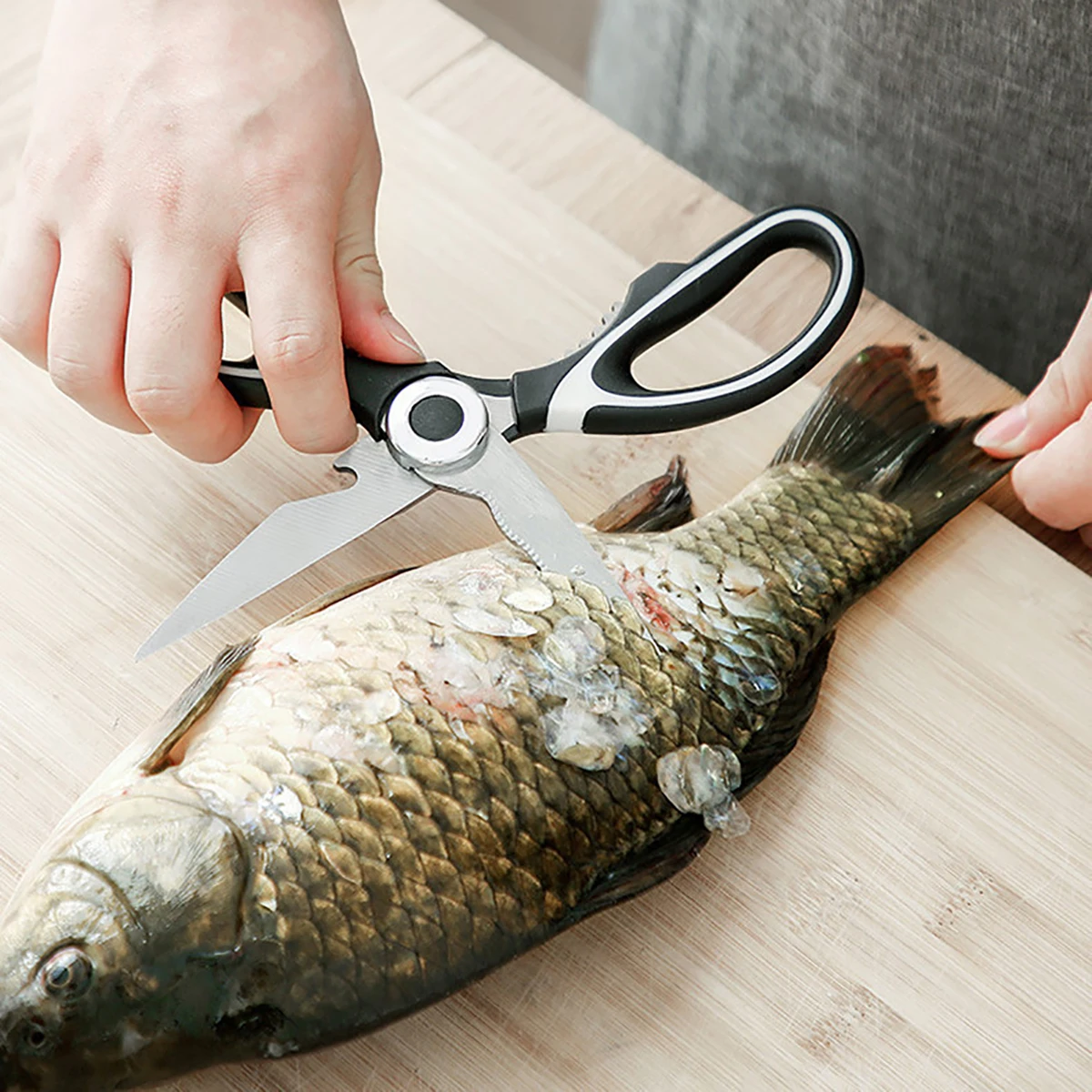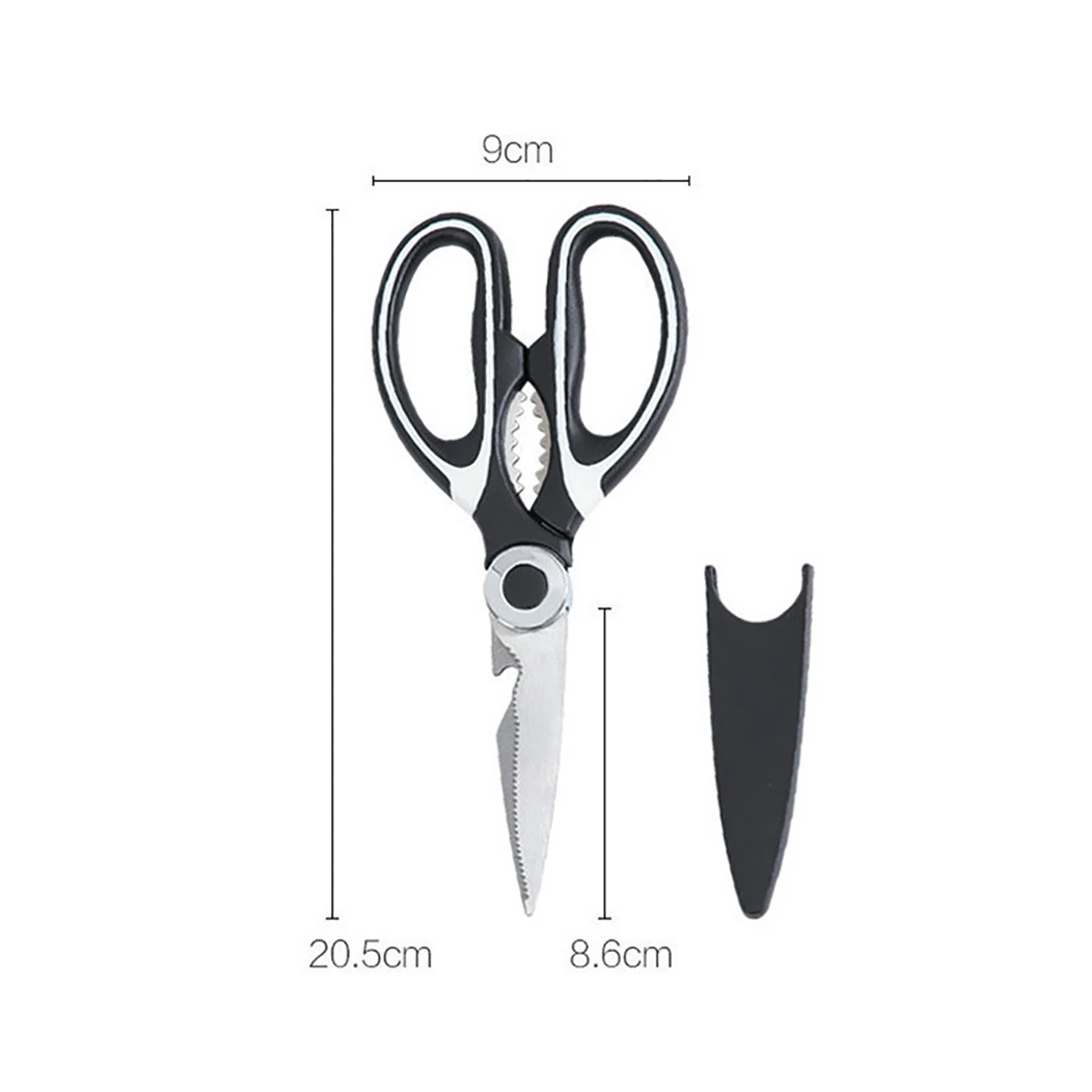 Features: Stainless Steel Material,High hardness Not easy to rust;PP Material Handle,Grip anti slip;Multi functional scissors, suitable for scraping fish scales, cutting meat, opening nuts, and bottle openers;Toothed design suitable for planing fish scales, simple and easy to use;Concave design, suitable for cutting objects that are prone to slipping off;Clever design in the middle of the handle, sharp teeth for anti slip, and the ability to grip walnuts tightly with force;Reverse buckle design, can be used to open bottle caps;Humanized anti slip handle, large grip hole, frosted surface treatment, more comfortable grip and anti slip